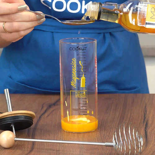 - Mélangez avec le fouet spécial pour obtenir une parfaite émulsion très rapidement.